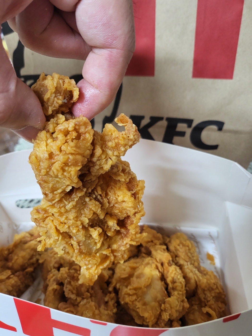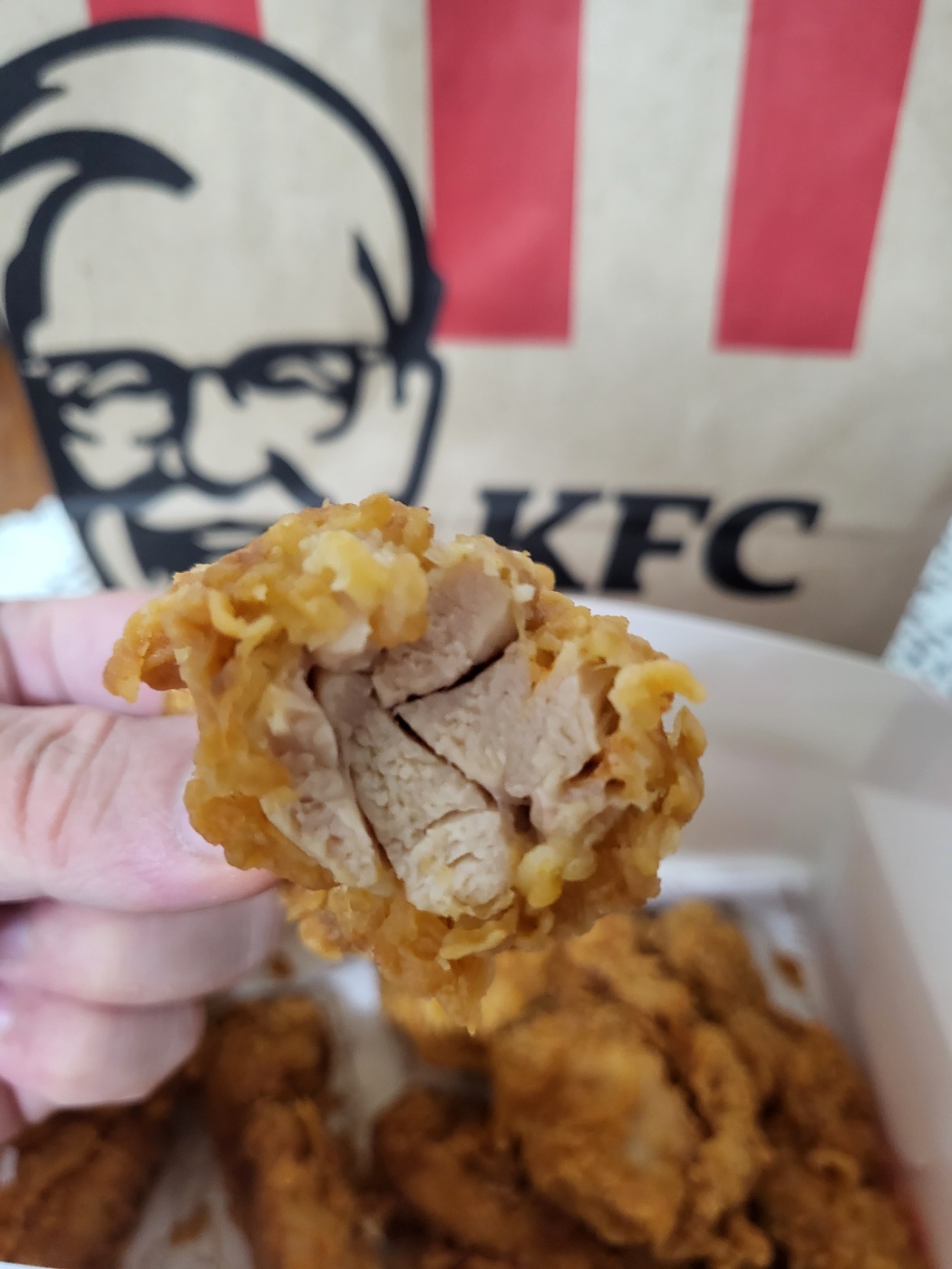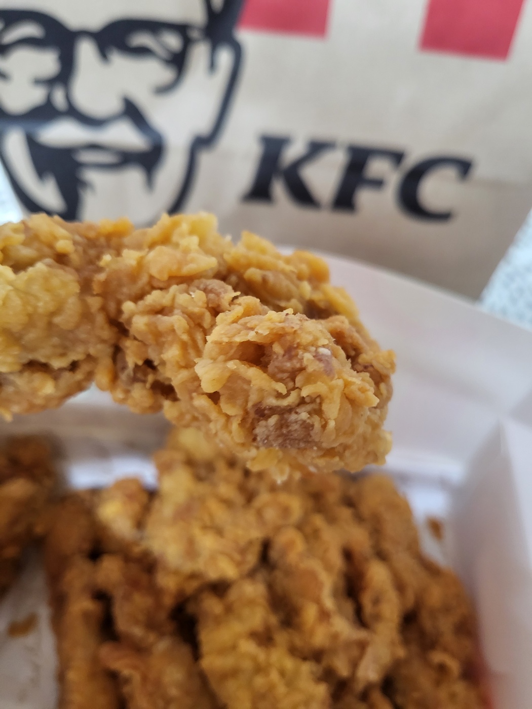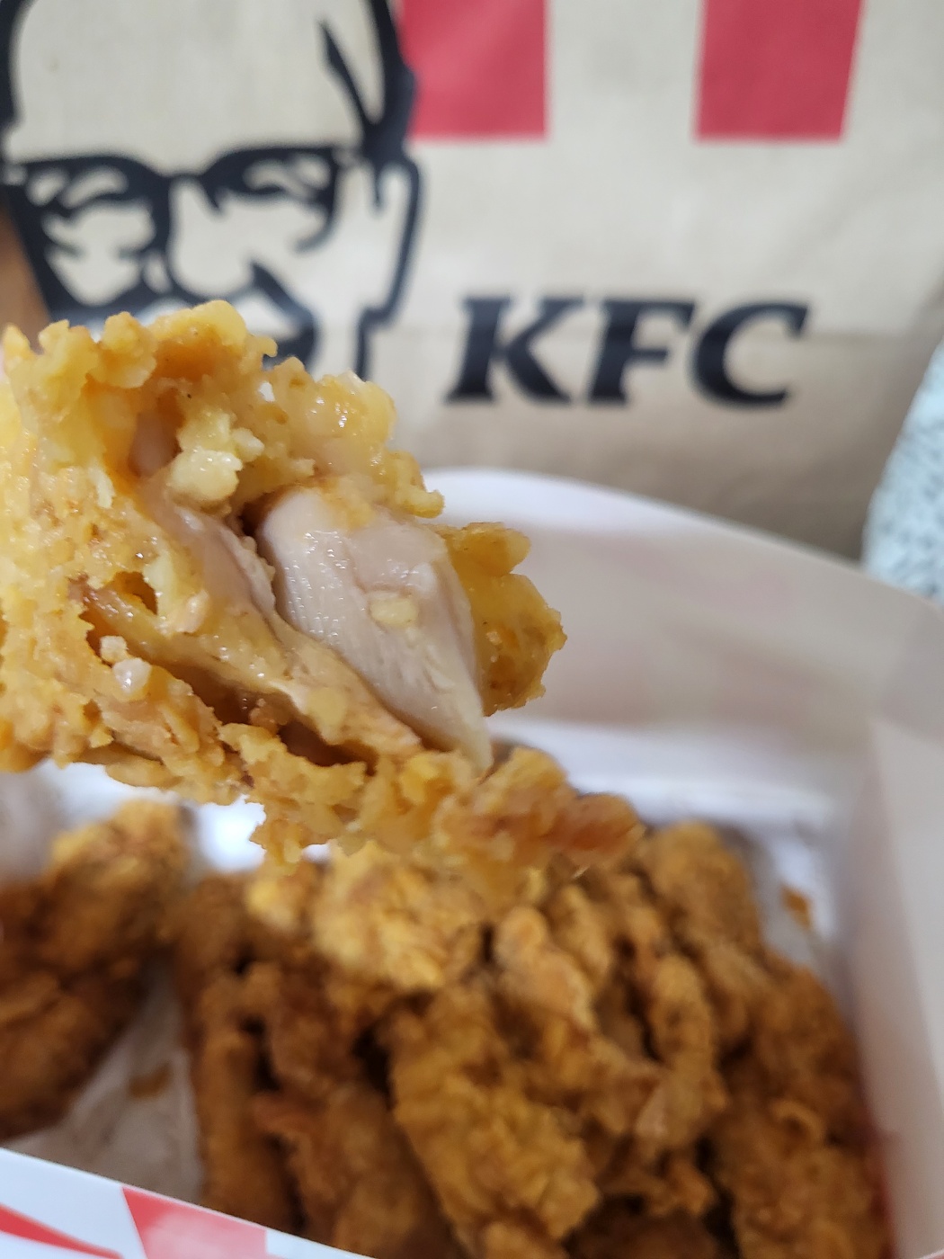 맛 평가는 아주 아주 주관적인 태도로 임할테니 너른 양해 바란다. 반박 시 당신 말이 맞다. 위 사진을 보면 튀김 결이 정말 입에 넣지 않고는 못 배길 정도로 예술이다. 포장지를 뚫고 풍겨져 나오는 그윽한 튀긴 닭의 향 또한 가히 형언할 수 없는 지경이다. 그도 그렇듯 이미 KFC는 1952년부터 이어져 내려온 '헤리티지' 치킨으로 정평이 나 있다. 서둘러 입에 넣어보니 닭의 통다리 순살로 만들어 겉은 바삭하고 속은 촉촉해 씹는 즐거움이 쏠쏠하다.