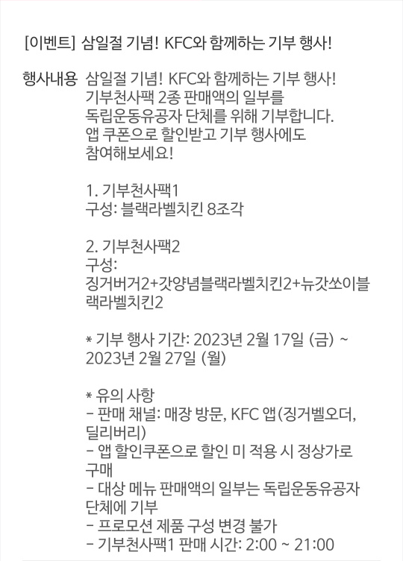 '먹잘알'들은 다들 알다시피 KFC에는 '치킨 나이트'라는 행사가 있다. 매일 저녁 아홉 시부터 치킨 단품메뉴에 한해 1+1이기에 단품 종류 별로 한 조각씩 사서 주문하는 게 '국룰'이다. 치킨 나이트까지는 한 시간도 채 남지 않아 고민이 되었지만 마침 삼일절 기념 이벤트로 블랙라벨치킨 8조각이 무려 3,000원이나 할인 중에 있어 바로 주문했다.