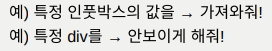 CSS에서는 선택자로 class를 썼다면, jQuery에서는 id 값을 통해 특정 버튼/ 인풋박스/ div/ ... 등을 가리키게 된다.