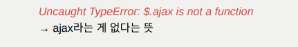 Ajax는 jQuery를 임포트한 페이지에서만 동작이 가능하다. http://google.com/과 같은 화면에서 개발자 도구를 열면, jQuery가 임포트 되어있지 않기 때문에 아래와 같은 에러가 뜬다.
