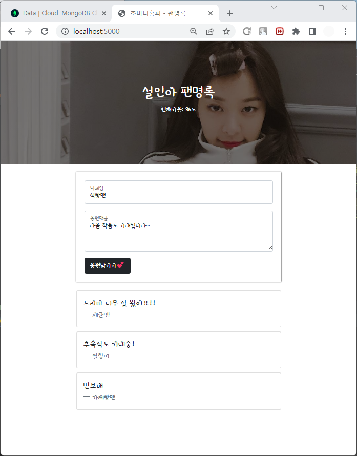 두 가지 기능이 붙어있어야하는데 첫번째는 응원남기기(post) 정보 입력 후 버튼클릭 시 주문목록에 추가되어야함, 두번째는 응원보기(get) 페이지 로딩 후 하단 응원 목록이 자동으로 보여야 함.