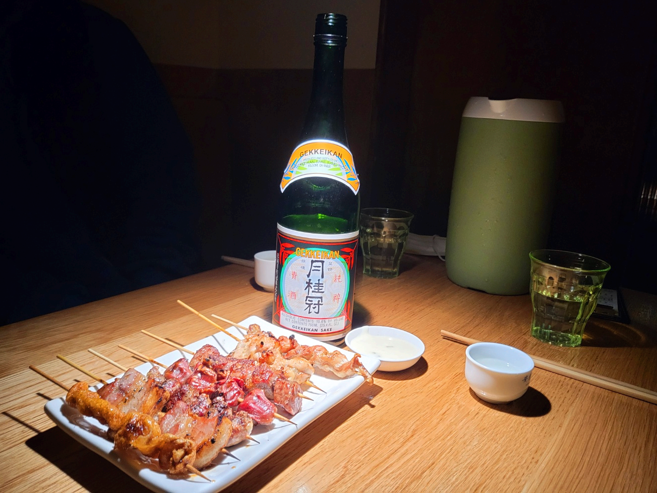 월계관 준마이는 첫맛은 시고 중간맛은 과일의 단맛이 느껴지며 끝맛은 다시 산미가 부드럽게 넘어간다. 도수는 15.6%로 소주보다는 낮은 편이며 복분자주와 비슷하다. 바깥 날씨는 추운데 막상 술집 분위기에 무르익다 보니 우리는 레이슈(冷酒; 5도 내외로 차게 마시는 사케)로 했다.