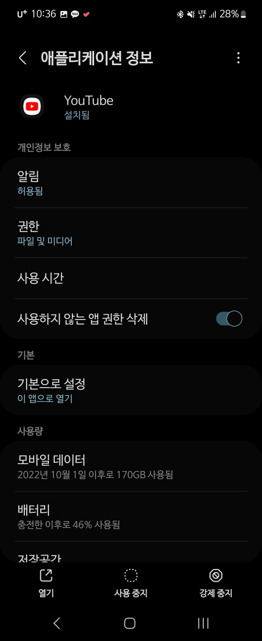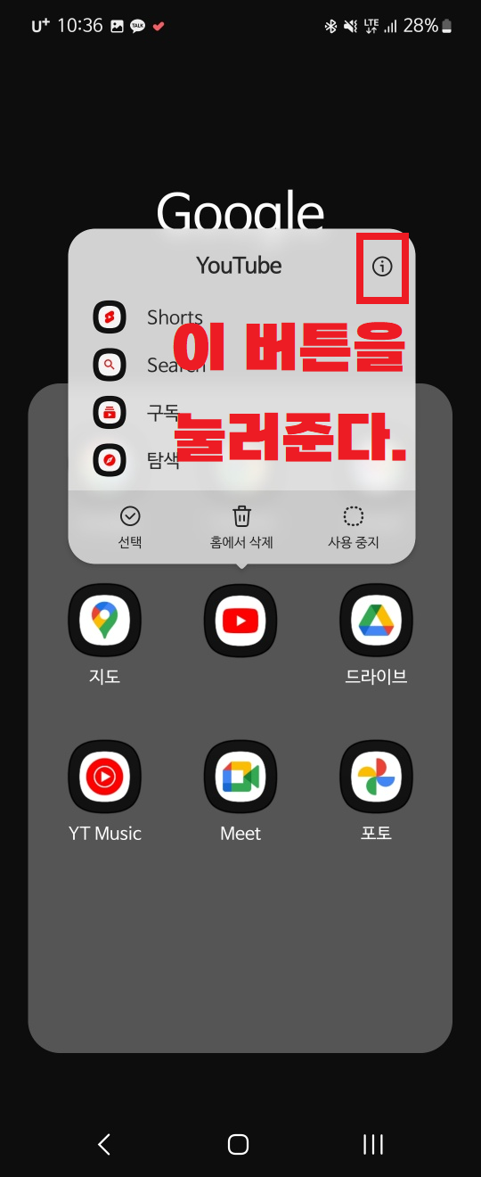 구글 폴더에 들어가 'YouTube' 아이콘을 꾹 눌러주면 나오는 우측 상단의 'ⓘ'를 클릭해 준다(위 스크린숏 참고).