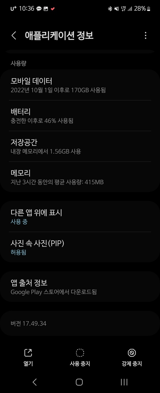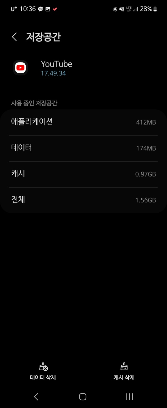 좌측화면처럼 '애플리케이션 정보'창이 나오면 아래로 스크롤을 내려서 '저장공간'을 눌러준다. 위 스크린숏을 보면 알겠지만 '내장 메모리에서 1.56GB 사용'이라는 문구부터가 범상치 않다.