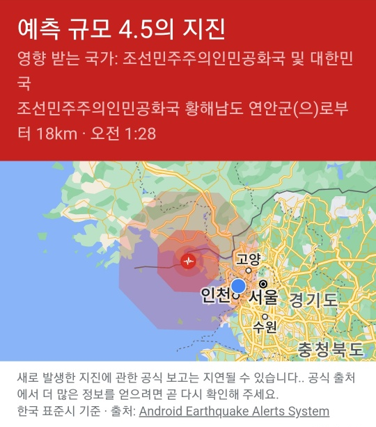 이제 한반도도 지진으로부터 자유롭지 못하다는 인식은 이미 굳어진 것 같다. 구글에 따르면 이번 지진은 예측 규모 4.5의 지진으로 영향받은 국가에 북한도 들어가있으며 정확히는 북한 황해남도 연안군으로부터 18km 부근이라고.