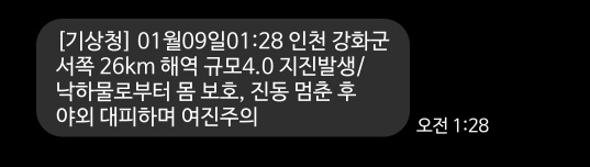 새벽 중에 기상청으로부터 '긴급 재난 문자'가 와서 깜짝놀랐다. 1월 9일 오전 1시 28분에 인천 강화군 서쪽 26km 해역에서 규모 4.0의 지진이 발생되어 낙하물로부터 몸을 보호, 진동 멈춘 후 야외 대피하여 여진을 주의하라는 내용이었다.