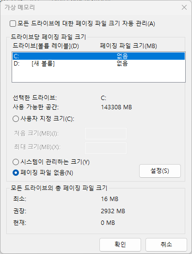 상단의 '모든 드라이브에 대한 페이징 파일 크기 자동관리' 체크해제 > 중간 부분의 '사용 가능한 공간'에서 '페이징 파일 없음'을 클릭 > 설정 > 예 > 재시작