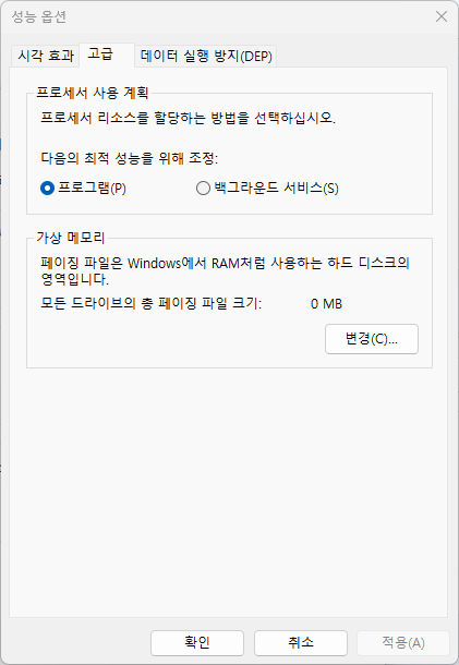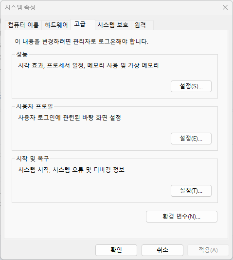 성능 > 고급 탭 > 가상 메모리 변경 클릭