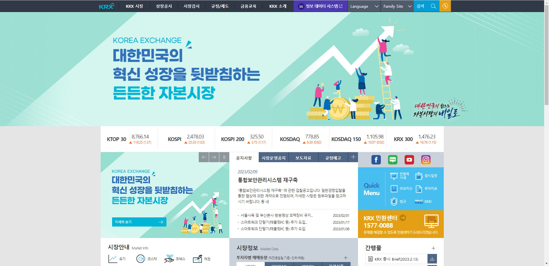 네 번째는 '한국거래소'를 추천한다. 한국증권거래소의 공식 웹사이트로 실시간 시장 데이터와 상장 기업 및 재무 실적에 대한 보다 정확하고 상세한 정보를 제공한다.