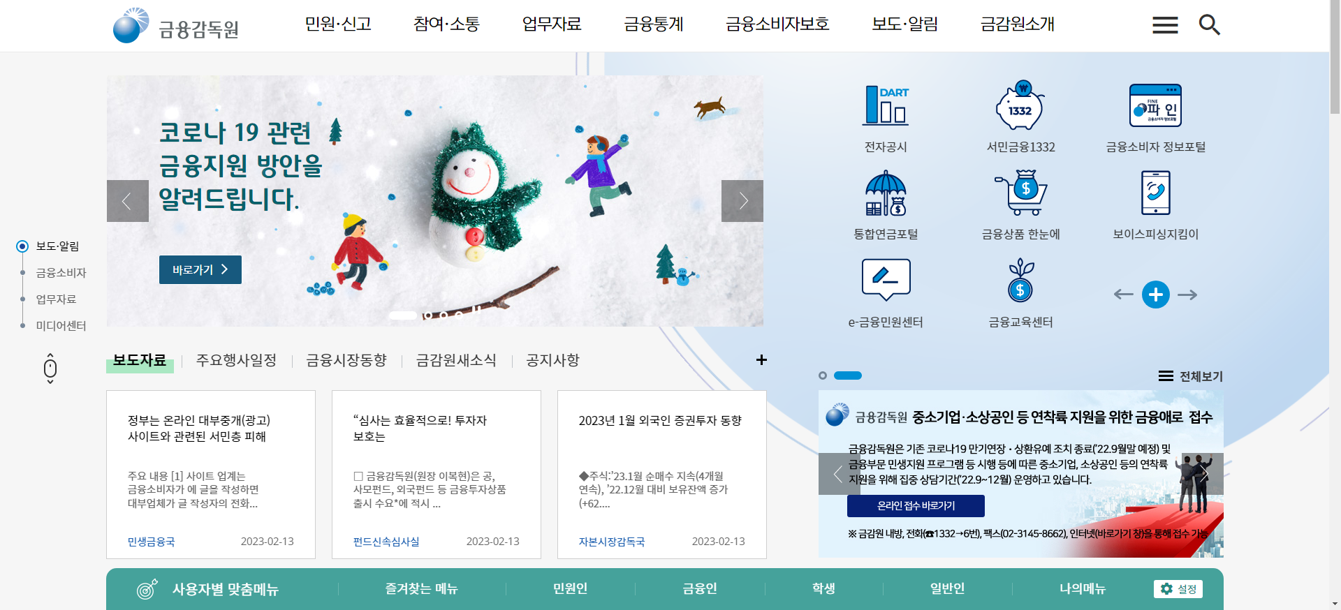 마지막 다섯 번째는 '금융감독원'을 추천한다. 한국금융규제기관의 공식 홈페이지로 금융규제와 시장동향, 투자기회 등의 정보를 제공한다.