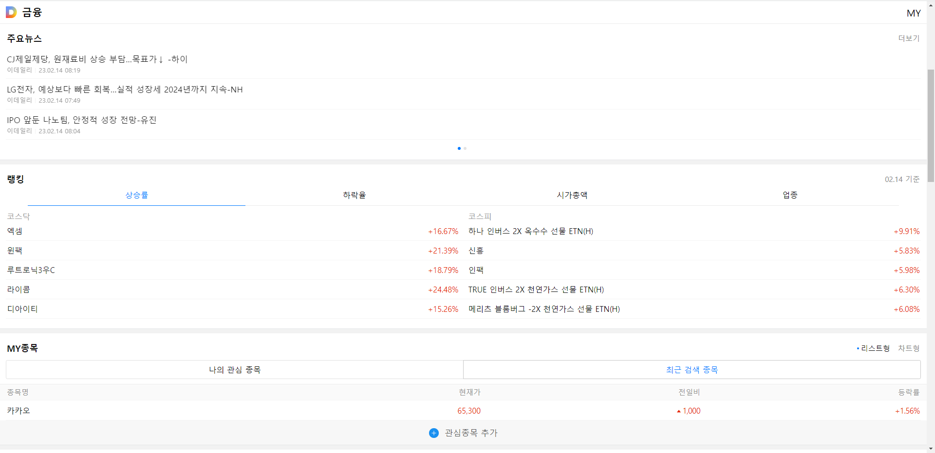 두 번째로 '다음금융'을 추천한다. 네이버 증권 못지않게 실시간 시장 데이터, 뉴스 및 분석을 제공하는 인기만점 웹사이트다. 검색 등락률 상위 업종 및 상승 종목을 위주로 보여준다. 주식 및 포트폴리오를 추적하고 투자 옵션 비교를 도와주는 기능은 꽤 유용한 툴을 갖추고 있다.